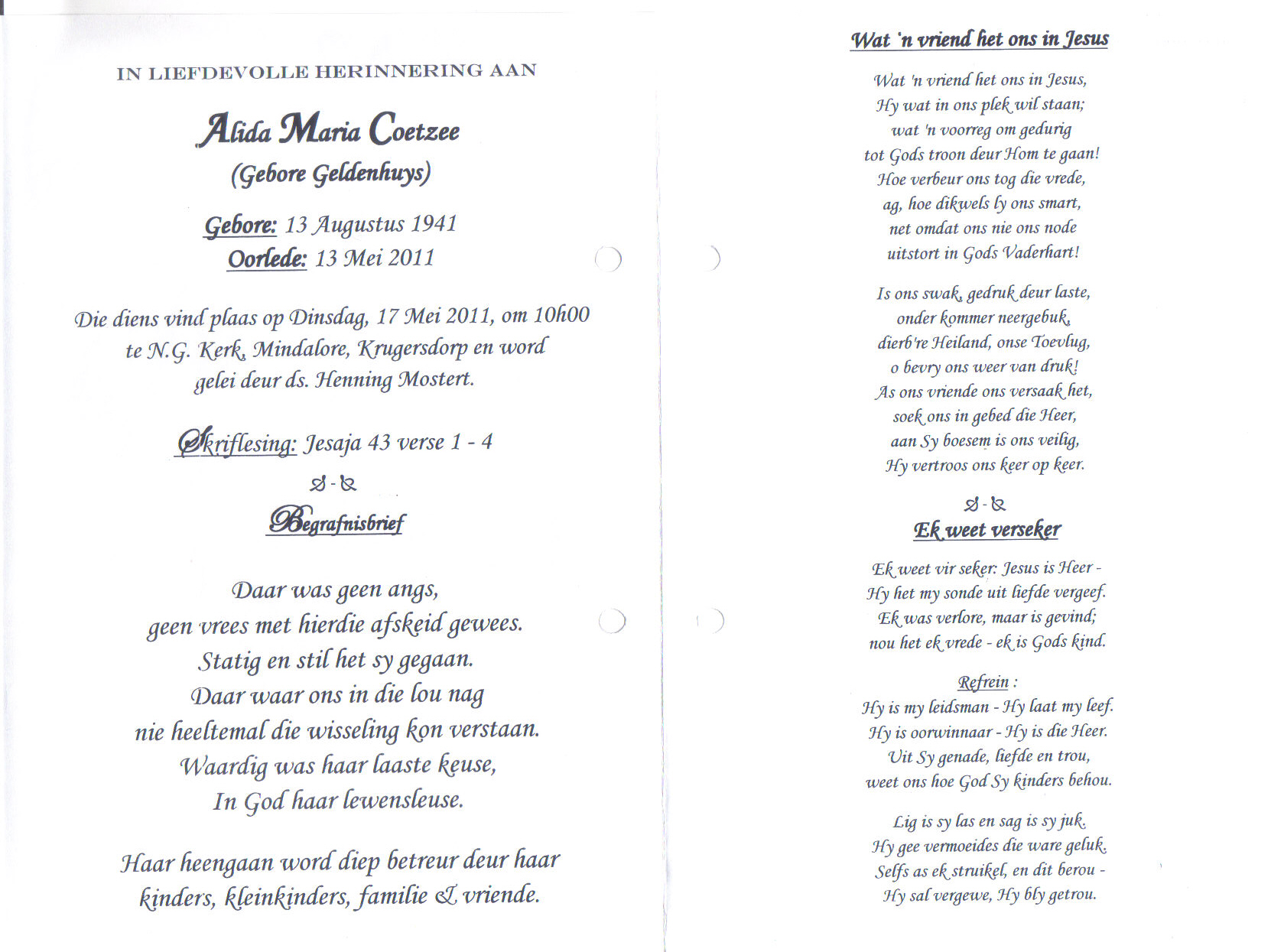 Funeral Programs / Begrafnisbriewe