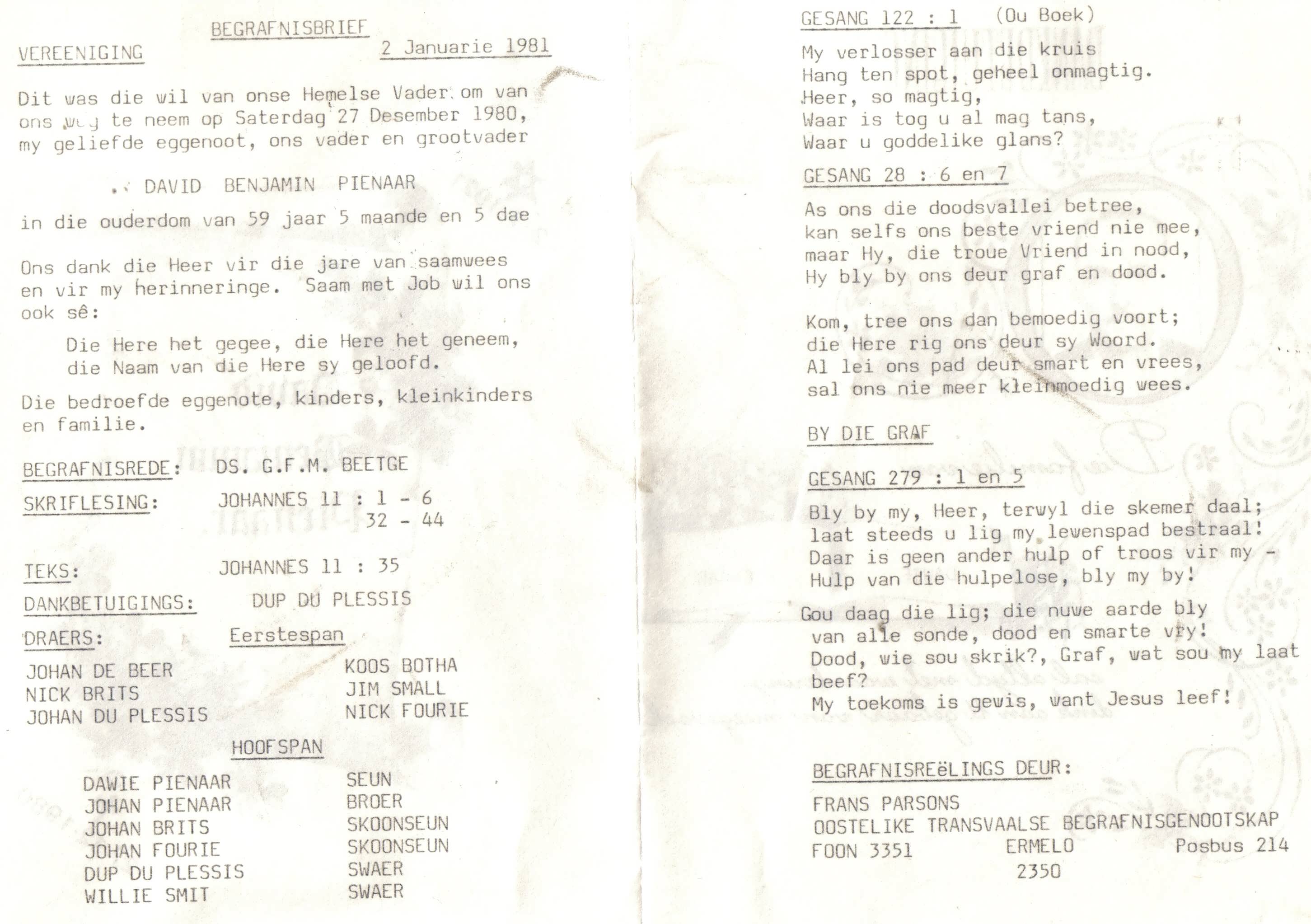 Funeral Programs / Begrafnisbriewe