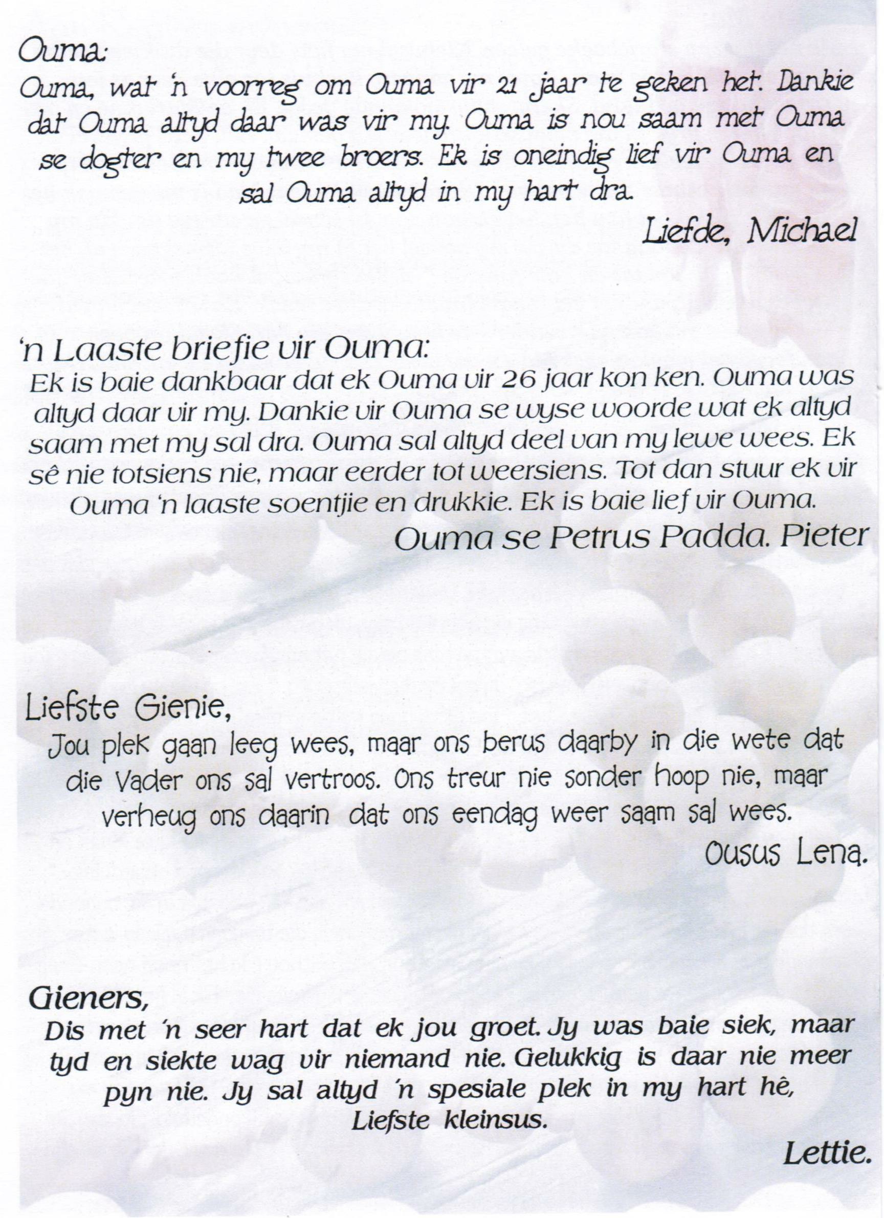 Volgens E-mail ontvang vanaf Lourens De Jager gedateer 20260115 die volgende addisionele info: Goeie dag Hendrik Sien aangeheg die begrafnisbrief van Regina Catharina Roets (Geb. CLAASSENS). Sy was die jongste kind van Jacobus William (Koos) CLAASSENS (2 Aug 1897- 16 Mei 1978) en Regina Catharina (Katriena) KLEYNHANS(4 Mrt 1901- 3 Apr 1983) In die CLAAS(S)EN geslagsregister (bl.697) is sy gelys as: A2b4c10d1e4f5g5h4i5 (nommer 16255) (Claassen, N. & Claassen,G.H. Die Claas(s)en afstammelinge in Suid-Afrika. 2001.) Sy is vernoem na haar ma- wat op haar beurt weer vernoem is na haar ouma Regina Catharina Celliers. Haar man Johannes Cornelius Michael (Mike) Roets was 'n landros gewees. Vriendelike Groete, Christiaan Lourens (Lourens) de Jager